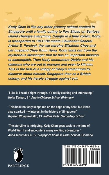 Kody Chan is like any other primary school student in Singapore until a family outing to Fort Siloso on Sentosa Island changes everything. Caught in a time vortex, Kody is transported to 1941! He meets Lieutenant General Arthur E. Percival, the war heroine Elizabeth Choy, and her husband Choy Khun Heng. Kody finds out from the mysterious messenger that he has an important mission to accomplish. Then Kody encounters Diablo and his daimons, who are out to ensnare and even to kill him. This is the first of a trilogy of Kodys adventures to discover about himself, Singapore then as a British colony, and his heroic struggle against evil.