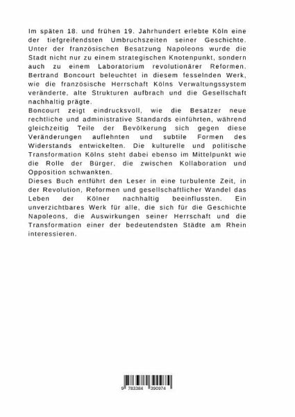Im späten 18. und frühen 19. Jahrhundert erlebte Köln eine der tiefgreifendsten Umbruchszeiten seiner Geschichte. Unter der französischen Besatzung Napoleons wurde die Stadt nicht nur zu einem strategischen Knotenpunkt, sondern auch zu einem Laboratorium revolutionärer Reformen. Bertrand Boncourt beleuchtet in diesem fesselnden Werk, wie die französische Herrschaft Kölns Verwaltungssystem veränderte, alte Strukturen aufbrach und die Gesellschaft nachhaltig prägte.Boncourt zeigt eindrucksvoll, wie die Besatzer neue rechtliche und administrative Standards einführten, während gleichzeitig Teile…mehr