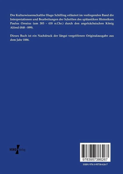 Der Kulturwissenschaftler Hugo Schilling erläutert im vorliegenden Band die Interpretationen und Bearbeitungen der Schriften des spätantiken Historikers Paulus Orosius (um 385 - 418 n.Chr.) durch den angelsächsischen König Alfred (848 - 899).