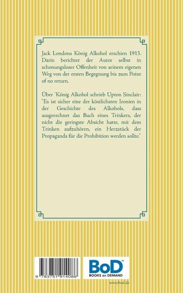 Jack Londons König Alkohol erschien 1913. Darin berichtet der Autor selbst in schonungsloser Offenheit von seinem eigenen Weg von der ersten Begegnung bis zum Point of no return.Über 'König Alkohol schrieb Londons Schriftstellerkollege und Freund Upton Sinclair: "Es ist sicher eine der köstlichsten Ironien in der Geschichte des Alkohols, dass ausgerechnet das Buch eines Trinkers, der nicht die geringste Absicht hatte, mit dem Trinken aufzuhören, ein Herzstück der Propaganda für die Prohibition werden sollte."