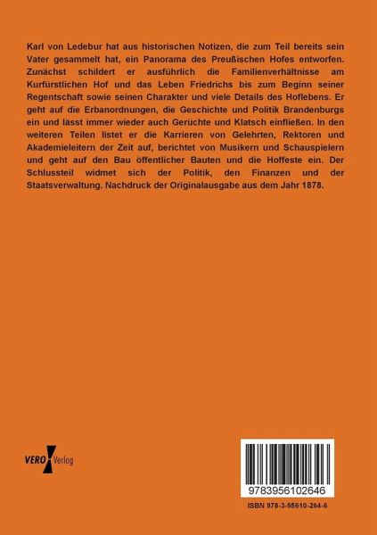 Karl von Ledebur hat aus historischen Notizen, die zum Teil bereits sein Vater gesammelt hat, ein Panorama des Preußischen Hofes entworfen. Zunächst schildert er ausführlich die Familienverhältnisse am Kurfürstlichen Hof und das Leben Friedrichs bis zum Beginn seiner Regentschaft sowie seinen Charakter und viele Details des Hoflebens. Er geht auf die Erbanordnungen, die Geschichte und Politik Brandenburgs ein und lässt immer wieder auch Gerüchte und Klatsch einfließen. In den weiteren Teilen listet er die Karrieren von Gelehrten, Rektoren und Akademieleitern der Zeit auf, berichtet von Musikern und Schauspielern und geht auf den Bau öffentlicher Bauten und die Hoffeste ein. Der Schlussteil widmet sich der Politik, den Finanzen und der Staatsverwaltung. Nachdruck der Originalausgabe aus dem Jahr 1878.