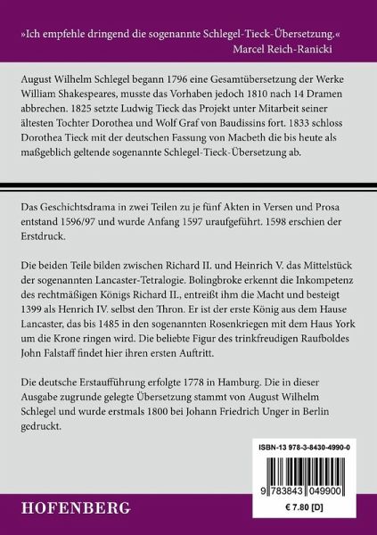 William Shakespeare: König Heinrich IV. Erster und zweiter Teil (King Henry IV) Das Geschichtsdrama in zwei Teilen zu je fünf Akten in Versen und Prosa entstand 1596/97 und wurde Anfang 1597 uraufgeführt. 1598 erschien der Erstdruck. Die beiden Teile bilden zwischen Richard II. und Heinrich V. das Mittelstück der sogenannten Lancaster-Tetralogie. Bolingbroke erkennt die Inkompetenz des rechtmäßigen Königs Richard II., entreißt ihm die Macht und besteigt 1399 als Henrich IV. selbst den Thron. Er ist der erste König aus dem Hause Lancaster, das bis 1485 in den sogenannten Rosenkriegen mit dem Haus York um die Krone ringen wird. Die beliebte Figur des trinkfreudigen Raufboldes John Falstaff findet hier ihren ersten Auftritt. Die deutsche Erstaufführung erfolgte 1778 in Hamburg. Die in dieser Ausgabe zugrunde gelegte Übersetzung stammt von August Wilhelm Schlegel und wurde erstmals 1800 bei Johann Friedrich Unger in Berlin gedruckt. Zur Schlegel-Tieck-Übersetzung: August Wilhelm Schlegel begann 1796 eine Gesamtübersetzung der Werke William Shakespeares, musste das Vorhaben jedoch 1810 nach 14 Dramen abbrechen. 1825 setzte Ludwig Tieck das Projekt unter Mitarbeit seiner ältesten Tochter Dorothea und Wolf Graf von Baudissins fort. 1833 schloss Dorothea Tieck mit der deutschen Fassung von Macbeth die bis heute als maßgeblich geltende sogenannte Schlegel-Tieck-Übersetzung ab. »Ich empfehle dringend die sogenannte Schlegel-Tieck-Übersetzung.« Marcel Reich-Ranicki König Heinrich IV. Erster Teil: Erstmals ins Deutsche übersetzt von Christoph Martin Wieland (1764). Die vorliegende Übersetzung stammt von August Wilhelm Schlegel. Erstdruck in: Shakspeare's dramatische Werke. Übersetzt von August Wilhelm Schlegel, Bd. 6, Berlin (Johann Friedrich Unger) 1800. König Heinrich IV. Zweiter Teil: Erstmals ins Deutsche übersetzt von Christoph Martin Wieland (1764). Die vorliegende Übersetzung stammt von August Wilhelm Schlegel. Erstdruck in: Shakspeare's dramatische Werke. Übersetzt von August Wilhelm Schlegel, Bd. 6, Berlin (Johann Friedrich Unger) 1800. Vollständige Neuausgabe. Herausgegeben von Karl-Maria Guth. Berlin 2015. Textgrundlage ist die Ausgabe: William Shakespeare: Sämtliche Werke in vier Bänden. Band 3, Herausgegeben von Anselm Schlösser. Berlin: Aufbau, 1975. Die Paginierung obiger Ausgabe wird in dieser Neuausgabe als Marginalie zeilengenau mitgeführt. Umschlaggestaltung von Thomas Schultz-Overhage unter Verwendung des Bildes: Willi, Tim Tempelhofer, 2015. Gesetzt aus Minion Pro, 11 pt.