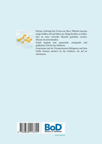 Mirjam verbringt ihre Ferien am Meer. Plötzlich tauchen einige Delfine auf und bitten sie, König Korallus zu helfen. Ihm ist seine wertvolle Muschel gestohlen worden. Mirjam ist einverstanden.Damit beginnt eine spannende, aufregende und gefährliche Zeit für das Mädchen.Gemeinsam mit der Nixenprinzessin Bellaguina und dem Delfin Dassino meistert sie die Gefahren, die auf sie zukommen.