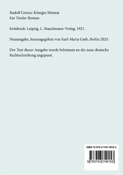 Rudolf Greinz: Königin Heimat. Ein Tiroler Roman Erstdruck: Leipzig, L. Staackmann-Verlag, 1921. Neuausgabe, herausgegeben von Karl-Maria Guth, Berlin 2025. Der Text dieser Ausgabe wurde behutsam an die neue deutsche Rechtschreibung angepasst. Umschlagabbildung: Josef Thoma, Motiv aus Tirol Gesetzt aus der Minion Pro, 11 pt. Henricus - Edition Deutsche Klassik GmbH
