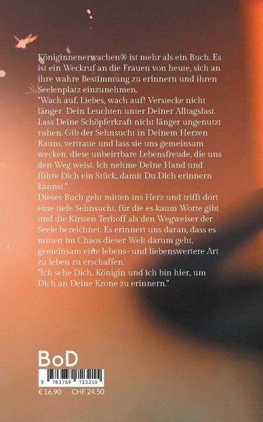 Königinnenerwachen® ist mehr als ein Buch. Es ist ein Weckruf an die Frauen von heute, sich an ihre wahre Bestimmung zu erinnern und ihren Seelenplatz einzunehmen. "Wach auf, Liebes, wach auf! Verstecke nicht länger Dein Leuchten unter Deiner Alltagslast. Lass Deine Schöpferkraft nicht länger ungenutzt ruhen. Gib der Sehnsucht in Deinem Herzen Raum, vertraue und lass sie uns gemeinsam wecken, diese unbeirrbare Lebensfreude, die Dir den Weg weist. Ich nehme Deine Hand und führe Dich ein Stück, damit Du Dich erinnern kannst." Dieses Buch geht mitten ins Herz und trifft dort eine tiefe Sehnsucht, für die es kaum Worte gibt und die Kirsten Terhoff als den Wegweiser der Seele bezeichnet. Es erinnert uns daran, dass es mitten im Chaos dieser Welt darum geht, gemeinsam eine lebens- und liebenswertere Art zu leben zu erschaffen. "Ich sehe Dich, Königin und ich bin hier, um Dich an Deine Krone zu erinnern."