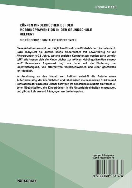 Diese Arbeit untersucht den möglichen Einsatz von Kinderbüchern im Unterricht. Dazu analysiert die Autorin sechs Kinderbücher mit Gewaltbezug für die Altersgruppen 4-11 Jahre. Welche sozialen Kompetenzen werden darin vermittelt? Wie lassen sich die Kinderbücher zur aktiven Mobbingprävention einsetzen? Besonderes Augenmerk legt sie dabei auf die Förderung der Empathiefähigkeit, von alternativen Verhaltensweisen und einer gestärkten Ich-Identität.In Anlehnung an das Modell von Petillon entwirft die Autorin einen Kriterienkatalog, der übersichtlich und tabellarisch die besonderen Stärken und Schwächen der einzelnen Bücher darstellt. Im Anschluss diskutiert sie verschiedene Möglichkeiten, die Kinderbücher in die Unterrichtseinheiten einzubauen, und gibt so Lehrern und Pädagogen wertvolle Impulse.Aus dem Inhalt:- Mobbing, Definition und Prävention;- Soziale Kompetenzen als Schlüsselkompetenzen;- Kinderbücher im Überblick;- "Nils wird gehänselt", "Ich bin der Bestimmer!", "Irgendwie anders", "Sophie wehrt sich", "Sonst bist du dran", "Warte nur, wir kriegen dich!"