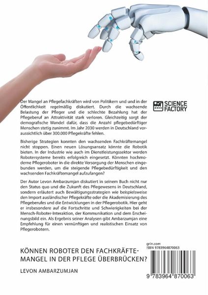 Der Mangel an Pflegefachkräften wird von Politikern und in der Öffentlichkeit regelmäßig diskutiert. Durch die wachsende Belastung der Pfleger und die schlechte Bezahlung hat der Pflegeberuf an Attraktivität stark verloren. Gleichzeitig sorgt der demografische Wandel dafür, dass die Anzahl pflegebedürftiger Menschen stetig zunimmt. Im Jahr 2030 werden in Deutschland voraussichtlich über 300.000 Pflegekräfte fehlen. Bisherige Strategien konnten den wachsenden Fachkräftemangel nicht stoppen. Einen neuen Lösungsansatz könnte die Robotik bieten. In der Industrie wie auch im Dienstleistungssektor werden Robotersysteme bereits erfolgreich eingesetzt. Könnten hochmoderne Pflegeroboter in die direkte Versorgung der Menschen eingebunden werden, um die steigende Pflegebedürftigkeit und den wachsenden Fachkräftemangel aufzufangen?Der Autor Levon Ambarzumjan diskutiert in seinem Buch nicht nur den Status quo und die Zukunft des Pflegewesens in Deutschland, sondern erläutert auch Bewältigungsstrategien wie beispielsweise den Import ausländischer Pflegekräfte oder die Akademisierung des Pflegeberufes und die Entwicklungen in der Pflegerobotik. Hier geht er insbesondere auf die Fortschritte und Schwierigkeiten bei der Mensch-Roboter-Interaktion, der Kommunikation und dem Erscheinungsbild ein. Als Ergebnis seiner Analysen gibt Ambarzumjan eine Empfehlung für einen vernünftigen und realistischen Einsatz von Pflegerobotern.