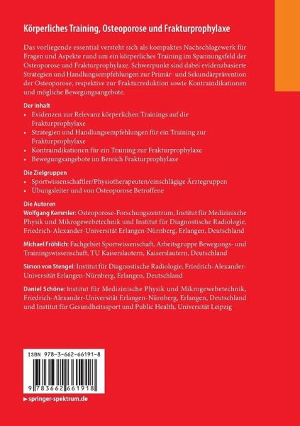 Das vorliegende essential versteht sich als kompaktes Nachschlagewerk für Fragen und Aspekte rund um ein körperliches Training im Spannungsfeld der Osteoporose und Frakturprophylaxe. Schwerpunkt sind dabei evidenzbasierte Strategien und Handlungsempfehlungen zur Primär- und Sekundärprävention der Osteoporose, respektive zur Frakturreduktion sowie Kontraindikationen und mögliche Bewegungsangebote.