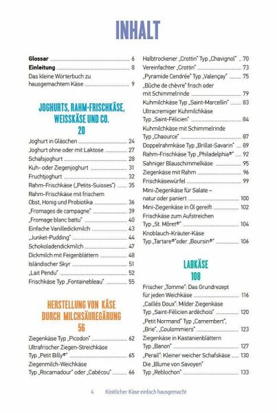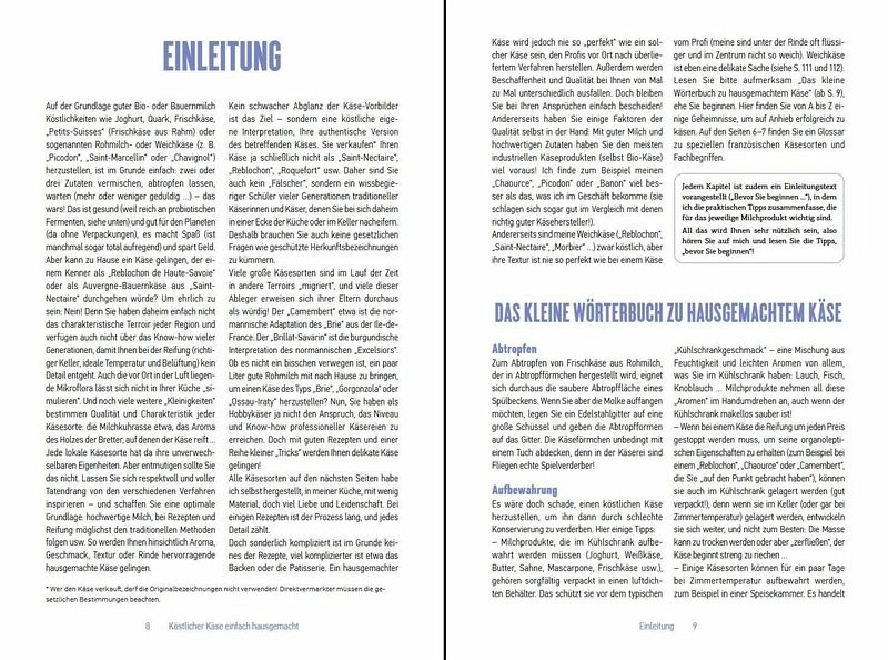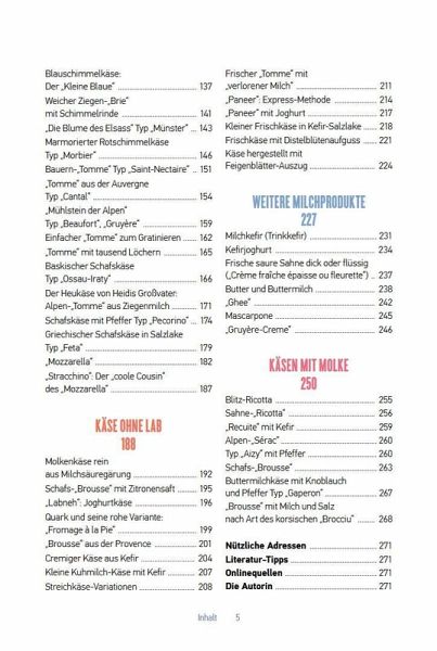 Das aus dem Französischen übersetzte Buch widmet sich in erster Linie den verschiedenen Frisch- und Weichkäsen, die auch zu Hause ohne den großen Aufwand hergestellt werden können, den die fachgerechte Erzeugung von Hartkäse erfordert. Frankreich gilt als das "Käseland" schlechthin, dementsprechend vielfältig sind auch die in diesem Buch vorgestellten, einfach selbst zu machenden Käsesorten, ob es sich um Brie und Camembert, Feta und Mozzarella, Doppelrahmkäse wie "Brillat-Savarin", in Öl gereifte Frischkäsewürfel, Mascarpone und Ricotta, baskischen Schafskäse oder korsischen Molkekäse, milden Weichkäse aus Schafsmilch, Almkäse in Kastanienblättern, Ziegenkäse à la Pecorino-Art, marmorierten Käse mit gewaschener Rinde in der Art von "Morbier" oder verschiedene Blauschimmelkäse handelt. Noch einfacher ist die Erzeugung unterschiedlicher Joghurts aus Kuh-, Schaf- oder Ziegenmilch, Kefir und isländischem Skyr, Quark (Topfen) oder Rahmfrischkäse in der Art von Philadelphia.
