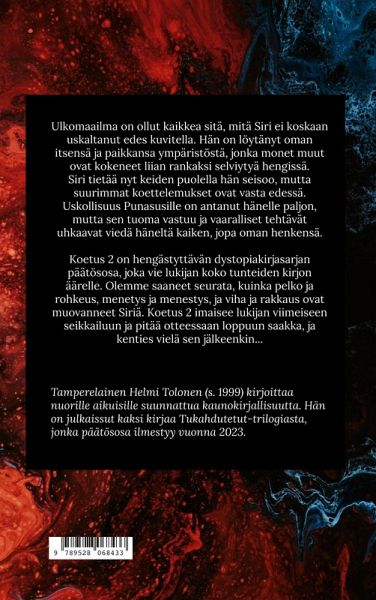 Ulkomaailma on ollut kaikkea sitä, mitä Siri ei koskaan uskaltanut edes kuvitella. Hän on löytänyt oman itsensä ja paikkansa ympäristöstä, jonka monet muut ovat kokeneet liian rankaksi selviytyä hengissä. Siri tietää nyt keiden puolella hän seisoo, mutta suurimmat koettelemukset ovat vasta edessä. Uskollisuus Punasusille on antanut hänelle paljon, mutta sen tuoma vastuu ja vaaralliset tehtävät uhkaavat viedä häneltä kaiken, jopa oman henkensä. Koetus 2 on hengästyttävän dystopiakirjasarjan päätösosa, joka vie lukijan koko tunteiden kirjon äärelle. Olemme saaneet seurata, kuinka pelko ja rohkeus, menetys ja menestys, ja viha ja rakkaus ovat muovanneet Siriä. Koetus 2 imaisee lukijan viimeiseen seikkailuun ja pitää otteessaan loppuun saakka, ja kenties vielä sen jälkeenkin...