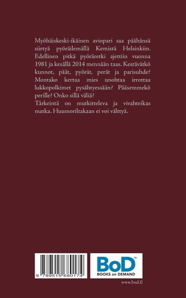 Myöhäiskeski-ikäinen aviopari saa päähänsä siirtyä pyöräilemällä Kemistä Helsinkiin. Edellinen pitkä pyöräretki ajettiin vuonna 1981 ja kesällä 2014 mennään taas. Kestävätkö kunnot, päät, pyörät, perät ja parisuhde? Montako kertaa mies unohtaa irrottaa lukkopolkimet pysähtyessään? Pääsemmekö perille? Onko sillä väliä? Tärkeintä on mutkitteleva ja vivahteikas matka. Huumoriltakaan ei voi välttyä.