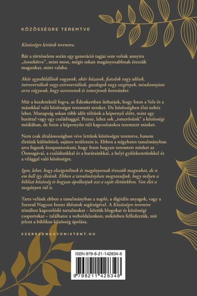 Közösségre lettünk teremtve. Bár a történelem során egy generáció tagjai sem voltak annyira "összekötve", mint most, mégis sokan magányosabbnak érezzük magunkat, mint valaha. Akár egyedülállóak vagyunk, akár házasok, fiatalok vagy id¿sek, introvertáltak vagy extrovertáltak, gazdagok vagy szegények, mindannyian arra vágyunk, hogy szeressenek és ismerjenek bennünket. Már a kezdetekt¿l fogva, az Édenkertben láthatjuk, hogy Isten a Vele és a másokkal való közösségre teremtett minket. De közösségben élni nehéz lehet. Manapság sokan több id¿t töltünk a képerny¿ el¿tt, mint egy baráttal vagy egy családtaggal. Persze, lehet sok "ismer¿sünk" a közösségi médiában, de Isten a képerny¿n túli kapcsolatokra teremtett minket. Nem csak általánosságban véve lettünk közösségre teremtve, hanem életünk különböz¿, sajátos területein is. Ebben a négyhetes tanulmányban arra fogunk összpontosítani, hogy Isten hogyan teremtett minket az Önmagával, a családunkkal és a barátainkkal, a helyi gyülekezetünkkel és a világgal való közösségre. Igen, lehet, hogy elszigeteltnek és magányosnak érezzük magunkat, de nem kell így élnünk. Ebben a tanulmányban megtanuljuk, hogy milyen a bibliai közösség és hogyan ápolhatjuk azt a saját életünkben. Van élet a magányon túl is. Tarts velünk ebben a tanulmányban a napló, a digitális forráscsomag, vagy a Szeresd Nagyon Istent applikáció segítségével. A Közösségre teremtve témához kapcsolódó tartalmakat - köztük blogokat és közösségi csoportokat - találhatsz a weboldalunkon, miközben felfedezzük, mit jelent a biblikus közösség ápolása.