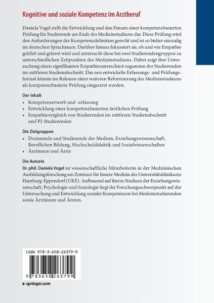 Daniela Vogel stellt die Entwicklung und den Einsatz einer kompetenzbasierten Prüfung für Studierende am Ende des Medizinstudiums dar. Diese Prüfung wird den Anforderungen der Kompetenzdefinition gerecht und ist so bisher einmalig im deutschen Sprachraum. Darüber hinaus fokussiert sie, ob und wie Empathie gelehrt und gelernt wird und untersucht diese bei zwei Studierendengruppen zu unterschiedlichen Zeitpunkten des Medizinstudiums. Dabei zeigt ihre Untersuchung einen signifikanten Empathieunterschied zugunsten der Studierenden im mittleren Studienabschnitt. Das neu entwickelte Erfassungs- und Prüfungsformat könnte im Rahmen einer weiteren Reformierung des Medizinstudiums als kompetenzbasierte Prüfung eingesetzt werden.
