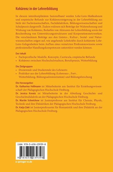 In diesem interdisziplinären Sammelband werden Lehr-Lern-Maßnahmen und empirische Befunde zur Kohärenzsteigerung in der Lehrerbildung aus Sicht der Fachwissenschaften, Fachdidaktiken, Bildungswissenschaften und Schulpraxis dargestellt. Zudem widmen sich Beiträge der Wahrnehmung und Wirkung von Kohärenz, Bedarfen von Akteuren der Lehrerbildung sowie der Beschreibung von Unterstützungsstrukturen und Kooperationsnetzwerken. Die verschiedenen Beiträge aus den Geistes-, Kultur-, Sozial- und Naturwissenschaften zeigen auf, wie angehende Lehrkräfte durch kohärente Lehr-Lern-Gelegenheiten beim Aufbau eines vernetzten Professionswissens sowie professioneller Handlungskompetenzen unterstützt werden können.