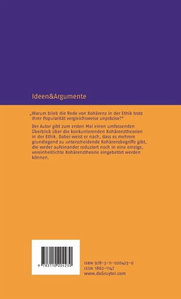 Der Autor zeigt, dass es den einen Kohärenzbegriff in der Ethik nicht gibt. Vielmehr lassen sich hier mindestens vier verschiedene Kohärenzbegriffe unterscheiden. Die Semantik dieser vier Kohärenzbegriffe wird in diesem Buch eingehend analysiert. Es wird untersucht, unter welchen metaethischen Vorannahmen diese Begriffe in eine Kohärenztheorie für die Ethik eingebettet werden können. Dabei zeigt sich, dass den unterschiedlichen Begriffen verschiedene Kohärenztheorien korrespondieren. Diese Kohärenztheorien sind inhaltlich heterogen und gehen von divergierenden, untereinander inkompatiblen metaethischen Vorannahmen aus. Deshalb ist es nicht möglich, die konkurrierenden Ansätze in eine einzige, umfassende Kohärenztheorie für die Ethik zu integrieren.