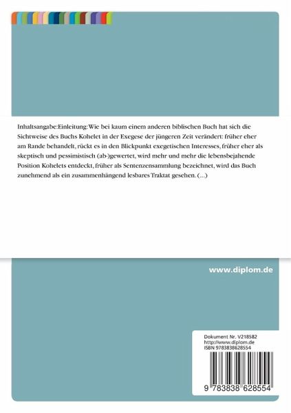 Inhaltsangabe:Einleitung: Wie bei kaum einem anderen biblischen Buch hat sich die Sichtweise des Buchs Kohelet in der Exegese der jüngeren Zeit verändert: früher eher am Rande behandelt, rückt es in den Blickpunkt exegetischen Interesses, früher eher als skeptisch und pessimistisch (ab-)gewertet, wird mehr und mehr die lebensbejahende Position Kohelets entdeckt, früher als Sentenzensammlung bezeichnet, wird das Buch zunehmend als ein zusammenhängend lesbares Traktat gesehen. Die Arbeit befasst sich mit diesem Paradigmenwechsel in der Sicht Kohelets. Sie gibt einen forschungsgeschichtlichen Abriss der älteren diachronen Positionen und einen Einblick in die höchst interessanten neueren synchronen Ansätze, um anschließend aufzuzeigen, wie stark eine Vorentscheidung zu einem diachronen bzw. synchronen Zugang zu Kohelet die Sichtweise, Wertung und Auslegung dieses Buches beeinflusst, und um schließlich für die neuere Lesung Kohelets als gegenwartsorientiertem Lebenskünstler in Gottes Gegenwart, der so zu einem hilfreichen ?Gesprächspartner? für den Menschen unserer Zeit wird, zu plädieren. Inhaltsverzeichnis:Inhaltsverzeichnis: Von der Wende in der Koheletexegese3 I.Die literarische Struktur des Koheletbuches in forschungsgeschichtlicher Perspektive7 1.Literarkritische Ansätze10 2.Sentenzen, Reflexionen, Topoi und ?biographische? Deutungen14 3.Kompositionsorientierte Ansätze22 II.Das theologische Profil Kohelets im Spiegel der Exegese31 1.Ältere Deutungen Kohelets31 2.Kohelet als Skeptiker und Pessimist35 3.Exkurs zu lbh (hæbæl)43 4.Theologie und Anthropologie Kohelets in positiver Sicht46 III.Zusammenhänge zwischen literarischer Struktur, theologischem Profil und Wertung des Buches Kohelet55 1.Wendung der Textwahrnehmung von der diachronen zur synchronen Präferenz56 2.Welcher Kohelet wird interpretiert?58 3.Die Ausscheidung theologischer Aussagen und der theologielose Kohelet59 4.Wieviel poetische Qualität wird Kohelet zugestanden?62 5.Differenzierung der negativen und positiven Gesamtwertungen Kohelets65 Der Eigenwert der Stimme Kohelets im Dialog68 Literatur73