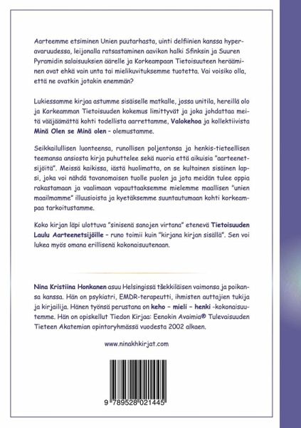 Aarteemme etsiminen Unien puutarhasta, uinti delfiinien kanssa hyperavaruudessa, leijonalla ratsastaminen aavikon halki Sfinksin ja Suuren Pyramidin salaisuuksien äärelle ja Korkeampaan Tietoisuuteen herääminen ovat ehkä vain unta tai mielikuvituksemme tuotetta. Vai voisiko olla, että ne ovatkin jotakin enemmän? Lukiessamme kirjaa astumme sisäiselle matkalle, jossa unitila, hereillä olo ja Korkeamman Tietoisuuden kokemus limittyvät ja joka johdattaa meitä vääjäämättä kohti todellista aarrettamme, Valokehoa ja kollektiivista Minä Olen se Minä olen - olemustamme. Seikkailullisen luonteensa, runollisen poljentonsa ja henkis-tieteellisen teemansa ansiosta kirja puhuttelee sekä nuoria että aikuisia "aarteenetsijöitä". Meissä kaikissa, iästä huolimatta, on se kultainen sisäinen lapsi, joka voi nähdä tavanomaisen tuolle puolen ja jota meidän tulee oppia rakastamaan ja vaalimaan vapauttaaksemme mielemme tämän maallisen "unien maailmamme" illuusioista ja kyetäksemme suuntautumaan kohti korkeampaa tarkoitustamme. Koko kirjan läpi ulottuva "sinisenä sanojen virtana" etenevä Tietoisuuden Laulu Aarteenetsijöille - runo toimii kuin "kirjana kirjan sisällä". Sen voi lukea myös omana erillisenä kokonaisuutenaan.