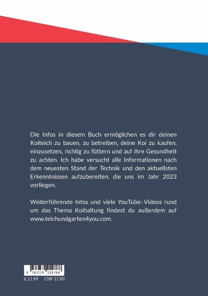 Die Infos in diesem Buch ermöglichen es dir deinen Koiteich zu bauen, zu betreiben, deine Koi zu kaufen, einzusetzen, richtig zu füttern und auf ihre Gesundheit zu achten. Ich habe versucht alle Informationen nach dem neuesten Stand der Technik und den aktuellsten Erkenntnissen aufzubereiten, die uns im Jahr 2023 vorliegen.Weiterführende Infos und viele YouTube-Videos rund um das Thema Koihaltung findest du außerdem auf www.teichundgarten4you.com.