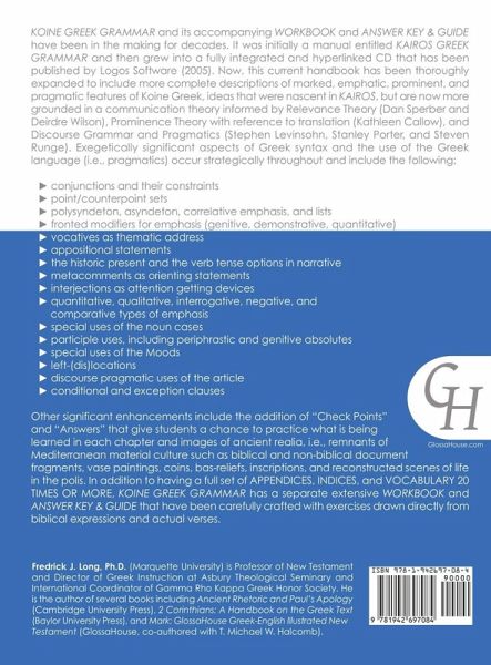 Koine Greek Grammar and its accompanying Workbook and Answer Key & Guide have been in the making for decades. It was first a small manual Kairos Greek Grammar; then it grew into a fully integrated and hyperlinked CD that has been published by Logos Bible Software (2005). Now, this current handbook––KOINE GREEK GRAMMAR: A BEGINNING-INTERMEDIATE EXEGETICAL AND PRAGMATIC HANDBOOK––has been thoroughly expanded to include my more explicit description of marked, emphatic, prominent, and pragmatic features of Greek, ideas that were nascent in KAIROS, but now grounded in a communication theory informed by Relevance Theory (Dan Sperber and Deirdre Wilson), Prominence Theory with reference to translation (Kathleen Callow), and Discourse Grammar and Pragmatics (Stephen Levinsohn, Stanley Porter, and Steven Runge). Exegetically significant aspects of Greek syntax and the use of the Greek language (i.e., pragmatics) occur strategically throughout KOINE GREEK GRAMMAR and include the following: - conjunctions and their constraints - point/counterpoint sets - polysyndeton, asyndeton, correlative emphasis, and lists - fronted modifiers for emphasis (genitive, demonstrative, quantitative) - vocatives as thematic address - appositional statements - the historic present and the verb tense options in narrative - metacomments as orienting statements - interjections as attention getting devices - quantitative, qualitative, interrogative, negative, and comparative types of emphasis - special uses of the noun cases - participle uses, including periphrastic and genitive absolutes - special uses of the Moods - left-(dis)locations - discourse pragmatic uses of the article - conditional and exception clauses Some of these discussions will have extended Intermediate-level treatments that are placed within greyed boxes. Other significant enhancements are the inclusion of CHECK POINTS that give students a chance to practice what is being learned in each chapter along with (SUGGESTED) ANSWERS that immediately follow. Scattered throughout KOINE GREEK GRAMMAR are images of ancient realia, i.e., remnants of Mediterranean material culture including biblical and non-biblical papyri fragments, vase paintings, coins, bas-reliefs, imperial artifacts, inscriptions, funerary stele, statues, gems, temples, maps, and reconstructed scenes of life in the polis. The language and syntax of the Greek NT is contextually located in these worlds. Still present (but improved) are the CASE IN POINTS at the end of each chapter that briefly describe how particular points of Greek grammar just presented helps us when interpreting the Greek NT. In other words, the CASE IN POINT illustrates how Greek grammar is valuable as a tool for the study of the NT. In addition to having a full APPENDIX, VOCABULARY OF WORDS OCCURRING 20 TIMES OR MORE, and INDICES, KOINE GREEK GRAMMAR has a separate extensive WORKBOOK AND ANSWER KEY & GUIDE. that has been carefully crafted with many exercises drawn directly from biblical expressions and actual verses.