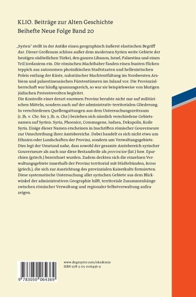 Das antike Syrien stellt einen geographisch und kulturell äusserst elastischen Begriff dar. In diesem Grossraum waren ausser dem heutigen Syrien weite Gebiete der südöstlichen Türkei, der ganze Libanon, Israel, Palästina und ein Teil Jordaniens enthalten. Die römischen Machthaber begegneten einem bunten Flickenteppich phönizischer und griechischer Stadtstaaten einerseits, jüdisch-palaestinensischer und nabatäischer Fürstentümer andererseits. Die Provinzialherrschaft war häufig spannungsreich, etwa von blutigen jüdischen Protestrevolten begleitet. Die Kontrolle eines derart enormen Gebiets wurde nicht nur durch militärische Mittel, sondern auch durch die administrative und territoriale Gliederung zu erzielen versucht. In verschiedenen Quellengattungen aus dem Untersuchungszeitraum (1. Jh. v. Chr. bis 3. Jh. n. Chr.) beziehen sich verschiedene Gebietsnamen auf Syrien: Syria, Phoinikia, Kommagene, Iudaea, Dekapolis, Koile Syria. Einige davon erscheinen in Inschriften römischer Gouverneure zur Umschreibung ihrer Amtsbereiche, etwa in der Form »Statthalter der Provinz Syria, Phoenice, Commagene«. Handelt es sich dabei jeweils um Verwaltungsgebiete oder um Ethnien? Letztere ist die in der Forschung gängige Sichtweise. Dem widerspricht, dass sowohl der gesamte Amtsbereich syrischer Gouverneure als auch nur seine Bestandteile offiziell als provinciae (lat. ) bzw. Eparchien (griech.) bezeichnet wurden. Bei ihrer Provinzeingliederung deckten sich die einzelnen Eparchien territorial mit Städtebünden, koina (griech.), die sich zur Ausrichtung des provinzialen Kaiserkults formierten. Eine systematische Untersuchung aller syrischen Gebiete aus dem Blickwinkel der administrativen Geographie steht in der bisherigen Forschung noch aus. Sie hilft, territoriale Zusammenhänge aufzuzeigen zwischen römischer Verwaltung und regionaler Selbstverwaltung.