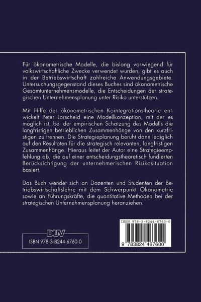 Für ökonometrische Modelle, die bislang vorwiegend für volkswirtschaftliche Zwecke verwendet wurden, gibt es auch in der Betriebswirtschaft zahlreiche Anwendungsgebiete. Untersuchungsgegenstand dieses Buches sind ökonometrische Gesamtunternehmensmodelle, die Entscheidungen der strategischen Unternehmensplanung unter Risiko unterstützen. Mit Hilfe der ökonometrischen Kointegrationstheorie entwickelt Peter Lorscheid eine Modellkonzeption, mit der es möglich ist, bei der empirischen Schätzung des Modells die langfristigen betrieblichen Zusammenhänge von den kurzfristigen zu trennen. Die Strategieplanung beruht dann lediglich auf den Resultaten für die strategisch relevanten, langfristigen Zusammenhänge. Hieraus leitet der Autor eine Strategieempfehlung ab, die auf einer entscheidungstheoretisch fundierten Berücksichtigung der unternehmerischen Risikosituation basiert.