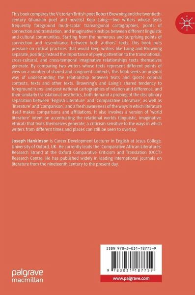 This book compares the Victorian British poet Robert Browning and the twentieth-century Ghanaian poet and novelist Kojo Laing-two writers whose texts frequently foreground multi-scalar transregional cartographies, points of connection and translation, and imaginative kinships between different linguistic and cultural communities. Starting from the numerous and surprising points of connection and resemblance between both authors' texts, this book puts pressure on critical practices that would keep writers like Laing and Browning separate, positing instead the importance of paying attention to the transnational, cross-cultural, and cross-temporal imaginative relationships texts themselves generate. By comparing two writers whose texts represent different points of view on a number of shared and congruent contexts, this book seeks an original way of understanding the relationship between texts and (post-) colonial contexts, texts and other texts. Browning's and Laing's shared tendencyto foreground trans- and post-national cartographies of relation and difference, and their similarly translational aesthetics, both demand a probing of the disciplinary separation between 'English Literature' and 'Comparative Literature', as well as 'literature' and 'comparison', and a fresh awareness of the ways in which literature itself makes comparisons and affiliations. It also involves a version of 'world literature' intent on accentuating the relational worlds (linguistic, imaginative, ethical) that texts themselves generate; a criticism sensitive to the ways in which writers from different times and places can still be seen to overlap.