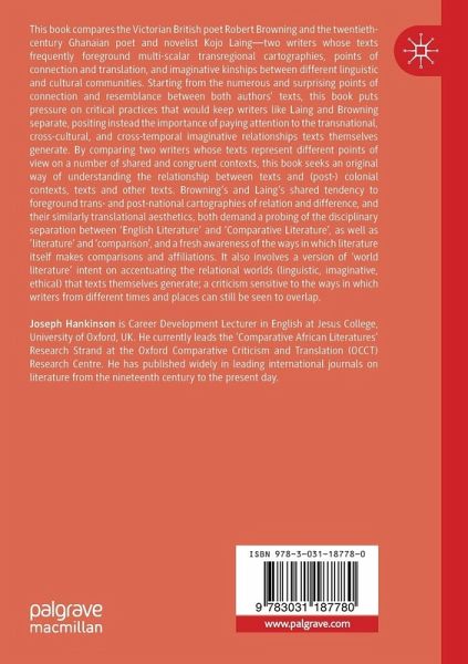 This book compares the Victorian British poet Robert Browning and the twentieth-century Ghanaian poet and novelist Kojo Laing-two writers whose texts frequently foreground multi-scalar transregional cartographies, points of connection and translation, and imaginative kinships between different linguistic and cultural communities. Starting from the numerous and surprising points of connection and resemblance between both authors' texts, this book puts pressure on critical practices that would keep writers like Laing and Browning separate, positing instead the importance of paying attention to the transnational, cross-cultural, and cross-temporal imaginative relationships texts themselves generate. By comparing two writers whose texts represent different points of view on a number of shared and congruent contexts, this book seeks an original way of understanding the relationship between texts and (post-) colonial contexts, texts and other texts. Browning's and Laing's shared tendencyto foreground trans- and post-national cartographies of relation and difference, and their similarly translational aesthetics, both demand a probing of the disciplinary separation between 'English Literature' and 'Comparative Literature', as well as 'literature' and 'comparison', and a fresh awareness of the ways in which literature itself makes comparisons and affiliations. It also involves a version of 'world literature' intent on accentuating the relational worlds (linguistic, imaginative, ethical) that texts themselves generate; a criticism sensitive to the ways in which writers from different times and places can still be seen to overlap.