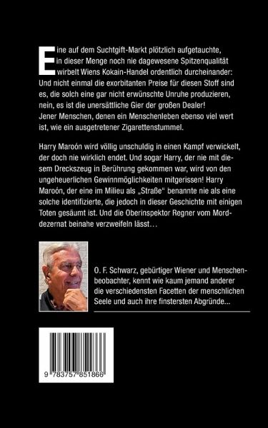 Kokain - Deine letzte Straße Eine auf dem Suchtgift-Markt plötzlich aufgetauchte, in dieser Menge noch nie dagewesene Spitzenqualität wirbelt Wiens Rauschgift-Szene ordentlich durcheinander. Und nicht einmal die exorbitanten Preise für diesen Stoff sind es, die solch eine gar nicht erwünschte Unruhe produzieren, nein: es ist die unersättliche Gier der großen Dealer. Jener Menschen, denen ein Menschenleben ebenso viel wert ist, wie ein ausgetretener Zigarettenstummel. Harry Maroon wird völlig unschuldig Ohrenzeuge eines Kampfes, der doch nie wirklich endet. Und Harry, der nie mit diesem Dreckszeug in Berührung gekommen war, kann die ungeheuerlichen Gewinne aus diesem Drecksgeschäft nicht fassen. Er, der eine im Milieu als Straße benannte, doch nie als eine solche identifizierte! Die jedoch in dieser Geschichte mit einigen Toten gesäumt ist. Und Harry sucht, um seinen engsten Freund Pierre aus den brutalen Ereignissen in diesem Geschäft herauszuhalten, die Hilfe des Rabbi. Des Rabbi, dem im Suchtgifthandel Wiens eigentlich nichts fremd ist. Und dessen Verschwiegenheit Oberinspektor Regner vom Morddezernat beinahe verzweifeln lässt.