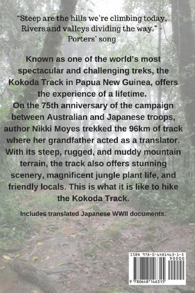 "Steep are the hills we're climbing today, Rivers and valleys dividing the way." -Porters' song Known as one of the world's most spectacular and challenging treks, the Kokoda Track in Papua New Guinea, offers the experience of a lifetime. On the 75th anniversary of the campaign between Australian and Japanese troops, author Nikki Moyes trekked the 96km of track where her grandfather acted as a translator. With its steep, rugged, and muddy mountain terrain, the track also offers stunning scenery, magnificent jungle plant life, and friendly locals. This is what it is like to hike the Kokoda Track. Includes photos and translated Japanese WWII documents.