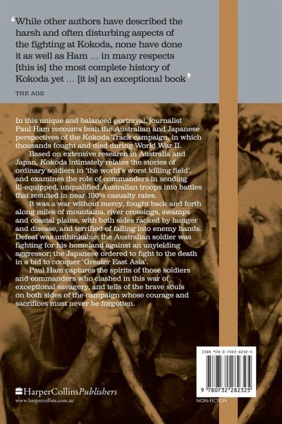 In a unique and balanced portrayal, renowned journalist Paul Ham recounts both the Australian and Japanese perspectives of the events on the hellish Papuan jungle trail where thousands fought and died during World War II. Based on extensive research in Australia and Japan, and including previously unpublished documents, Kokoda intimately relates the stories of ordinary soldiers in 'the world's worst killing field', and examines the role of commanders in sending ill-equipped, unqualified Australian troops into battles that resulted in near 100 per cent casualty rates. It was a war without mercy, fought back and forth along 90 miles (145 km) of river crossings, steep inclines and precipitous descents, with both sides wracked by hunger and disease, and terrified of falling into enemy hands. Defeat was unthinkable: the Australian soldier was fighting for his homeland against an unyielding aggressor; the Japanese ordered to fight to the death in a bid to conquer 'Greater East Asia'. Paul Ham captures the spirits of those soldiers and commanders who clashed in this war of exceptional savagery, and tells of the brave souls on both sides of the campaign whose courage and sacrifices must never be forgotten.
