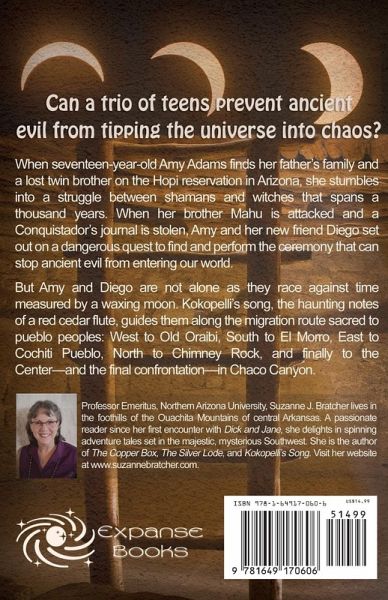 Three teens race against a waxing moon to prevent an ancient evil from tipping the universe into chaos. ¿When seventeen-year-old Amy Adams finds her father's family and a lost twin brother on the Hopi reservation in Arizona, she stumbles into a struggle between shamans and witches that spans a thousand years. After Mahu is attacked and a Conquistador's journal stolen, Amy and her new friend Diego set out on a dangerous quest to find and perform the ceremony that can stop ancient evil from entering our world. But Amy and Diego are not alone as they race against time measured by a waxing moon. Kokopelli's song, the haunting notes of a red cedar flute, guides them along the migration route sacred to pueblo peoples: West to Old Oraibi, South to El Morro, East to Cochiti Pueblo, North to Chimney Rock, and finally to the Center-and the final confrontation-in Chaco Canyon.