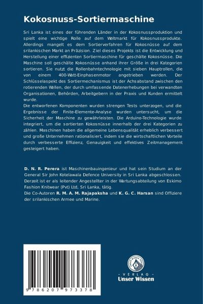 Sri Lanka ist eines der führenden Länder in der Kokosnussproduktion und spielt eine wichtige Rolle auf dem Weltmarkt für Kokosnussprodukte. Allerdings mangelt es dem Sortierverfahren für Kokosnüsse auf dem srilankischen Markt an Präzision. Ziel dieses Projekts ist die Entwicklung und Herstellung einer effizienten Sortiermaschine für geschälte Kokosnüsse. Die Maschine soll geschälte Kokosnüsse anhand ihrer Größe in drei Kategorien sortieren. Sie nutzt die Rollenbahntechnologie mit sieben Hauptrollen, die von einem 400-Watt-Einphasenmotor angetrieben werden. Der Schlüsselaspekt des Sortiermechanismus ist der Achsabstand zwischen den rotierenden Wellen, der durch umfassende Datenerhebungen bei verwandten Organisationen, Behörden, Arbeitgebern in der Praxis und Kunden ermittelt wurde.Die entworfenen Komponenten wurden strengen Tests unterzogen, und die Ergebnisse der Finite-Elemente-Analyse wurden untersucht, um die Sicherheit der Maschine zu gewährleisten. Die Arduino-Technologie wurde integriert, um die sortierten Kokosnüsse innerhalb der drei Kategorien zu zählen. Maschinen haben die allgemeine Lebensqualität erheblich verbessert und große Unternehmen rationalisiert, indem sie die wirtschaftlichen Vorteile durch verbesserte Effizienz, Genauigkeit und effektives Zeitmanagement gesteigert haben.