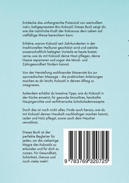 Entdecke das umfangreiche Potenzial von wertvollem nativ, kaltgepresstem Bio-Kokosöl. Dieses Buch zeigt dir, wie die natürliche Kraft der Kokosnuss dein Leben auf vielfältige Weise bereichern kann. Erfahre, warum Kokosöl seit Jahrhunderten in der traditionellen Heilkunst geschätzt wird und welche wissenschaftlich belegten Vorteile es heute bietet. Lerne, wie du mit Kokosöl deine Haut pflegen, deine Haare reparieren und sogar die Mund- und Zahngesundheit fördern kannst. Von der Herstellung wohltuender Mazerate bis zur ayurvedischen Massage - die praktischen Anleitungen machen es dir leicht, Kokosöl in deinen Alltag zu integrieren. Außerdem erhältst du kreative Tipps, wie du Kokosöl in der Küche einsetzt, für gesunde Smoothies, herzhafte Hauptgerichte und verführerische Schokoladenrezepte. Doch das ist noch nicht alles. Finde auch heraus, wie du mit Kokosöl deinen Haushalt nachhaltiger machen kannst, Leder und Holz pflegts, sowie auch dein Haustier verwöhnst. Dieses Buch ist der perfekte Begleiter, um die vielseitige Magie des Kokosöls zu erkunden und für dich zu nutzen. Für Gesundheit, Schönheit, Genuss und noch vieles mehr!