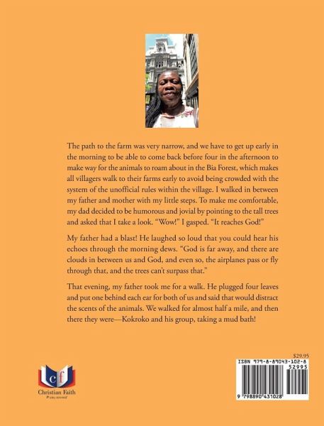 The path to the farm was very narrow, and we have to get up early in the morning to be able to come back before four in the afternoon to make way for the animals to roam about in the Bia Forest, which makes all villagers walk to their farms early to avoid being crowded with the system of the unofficial rules within the village. I walked in between my father and mother with my little steps. To make me comfortable, my dad decided to be humorous and jovial by pointing to the tall trees and asked that I take a look. "Wow!" I gasped. "It reaches God!" My father had a blast! He laughed so loud that you could hear his echoes through the morning dews. "God is far away, and there are clouds in between us and God, and even so, the airplanes pass or fly through that, and the trees can't surpass that." That evening, my father took me for a walk. He plugged four leaves and put one behind each ear for both of us and said that would distract the scents of the animals. We walked for almost half a mile, and then there they were--Kokroko and his group, taking a mud bath!