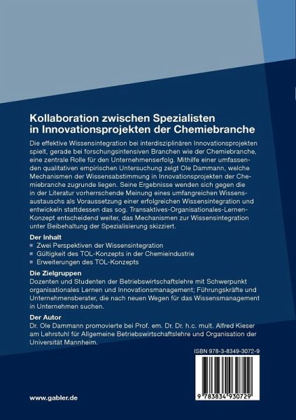 Die effektive Wissensintegration bei interdisziplinären Innovationsprojekten spielt, gerade bei forschungsintensiven Branchen wie der Chemiebranche, eine zentrale Rolle für den Unternehmenserfolg. Mithilfe einer umfassenden qualitativen empirischen Untersuchung zeigt Ole Dammann, welche Mechanismen der Wissensabstimmung in Innovationsprojekten der Chemiebranche zugrunde liegen. Seine Ergebnisse wenden sich gegen die in der Literatur vorherrschende Meinung eines umfangreichen Wissensaustausches als Voraussetzung einer erfolgreichen Wissensintegration und entwickeln stattdessen das sog. Transaktives-Organisationales-Lernen-Konzept entscheidend weiter, das Mechanismen zur Wissensintegration unter Beibehaltung der Spezialisierung skizziert.