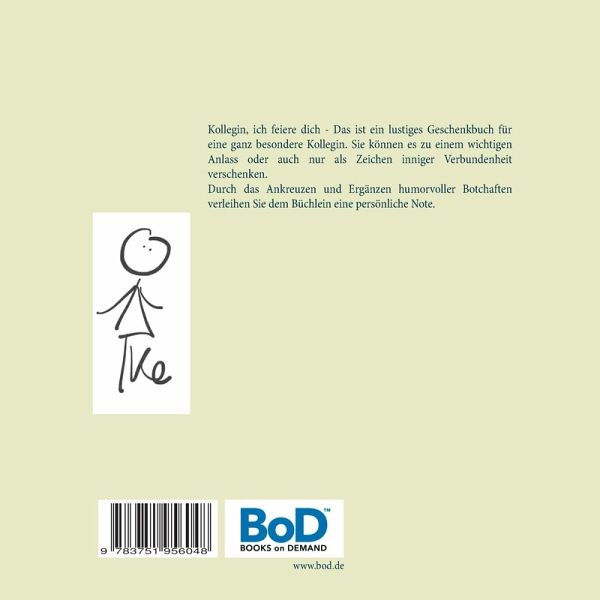 Kollegin, ich feiere dich - Das ist ein lustiges Geschenkbuch für eine ganz besondere Kollegin. Sie können es zu einem wichtigen Anlass oder auch nur als Zeichen inniger Verbundenheit verschenken.Durch das Ankreuzen und Ergänzen humorvoller Botchaften verleihen Sie dem Büchlein eine persönliche Note.