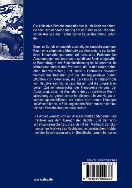 Stephan Schulz entwickelt erstmalig im deutschsprachigen Raum eine allgemeine Methodik zur Anwendung der kollektiven Entscheidungstheorie auf juristische Probleme bei Abstimmungen und untersucht auf dieser Basis ausgewählte Rechtsfragen der Beschlussfassung im Aktienrecht. Im Mittelpunkt stehen drei Probleme, die in der aktienrechtlichen Rechtsprechung und Literatur kontrovers diskutiert werden: das Bestehen und der Umfang positiver Stimmpflichten von Aktionären, die gerichtliche Inhaltskontrolle von Hauptversammlungsbeschlüssen und die ungeschriebenen Zustimmungsrechte der Hauptversammlung. Der Autor zeigt, dass mit Ausnahme der zu restriktiven Rechtsprechung zur gerichtlichen Inhaltskontrolle von Hauptversammlungsbeschlüssen die bisher vertretenen Lösungen im Wesentlichen im Einklang mit den Erkenntnissen der kollektiven Entscheidungstheorie stehen.