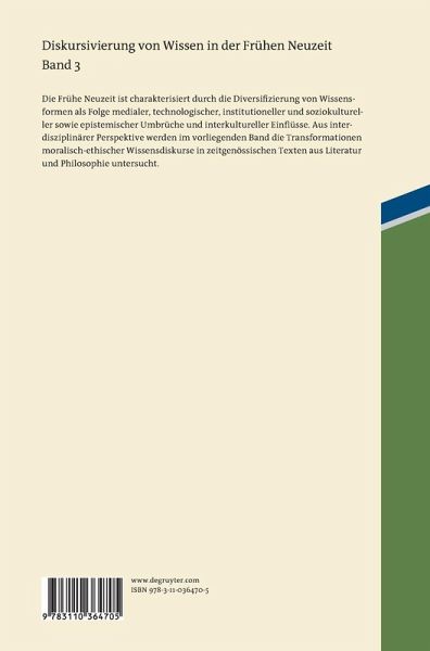 Die Frühe Neuzeit ist charakterisiert durch die exponentiell zunehmende Diversifizierung von Wissensformen und -diskursen als Folge medialer, technologischer, institutioneller und soziokultureller sowie epistemischer Umbrüche und interkultureller Einflüsse. Die Beiträge in diesem Band aus der Anglistik, Germanistik, Philosophie und Romanistik untersuchen die frühneuzeitlichen Transformationen und Diversifizierungen auf dem Gebiet des moralisch-ethischen Wissens in Europa. Im Fokus stehen literarische und philosophische Verhandlungen über Praktiken des Alltags, aber auch über Regeln der Repräsentation, Kommunikation und letztlich über den Status traditioneller Ethiken angesichts medialer Umwälzungen und Neuperspektivierungen. Die Dynamik der Generierung, Etablierung, Verbreitung, Kontrolle und Disqualifizierung von moralischem Wissen zeigt sich in der subtilen oder offenen Anfechtung, Unterminierung und langwierigen Aushöhlung der Bestandsqualitäten von Wissen, das in Wissensordnungen und Institutionen etabliert ist.