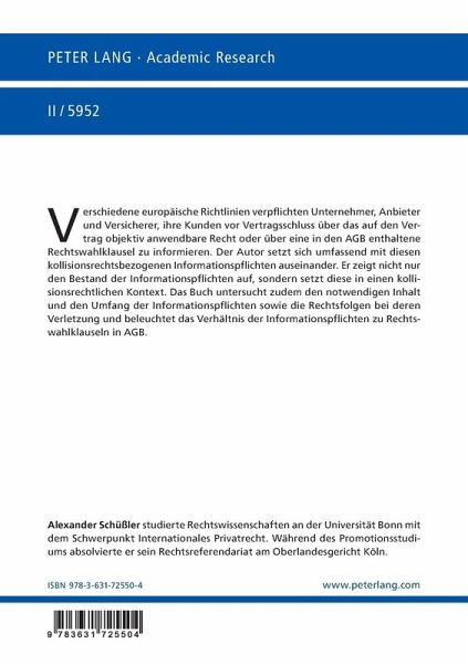 Verschiedene europäische Richtlinien verpflichten Unternehmer, Anbieter und Versicherer, ihre Kunden vor Vertragsschluss über das auf den Vertrag objektiv anwendbare Recht oder über eine in den AGB enthaltene Rechtswahlklausel zu informieren. Der Autor setzt sich umfassend mit diesen kollisionsrechtsbezogenen Informationspflichten auseinander. Er zeigt nicht nur den Bestand der Informationspflichten auf, sondern setzt diese in einen kollisionsrechtlichen Kontext. Das Buch untersucht zudem den notwendigen Inhalt und den Umfang der Informationspflichten sowie die Rechtsfolgen bei deren Verletzung und beleuchtet das Verhältnis der Informationspflichten zu Rechtswahlklauseln in AGB.