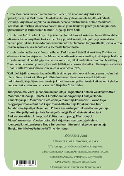 TIMO MONTONEN KORREHTUURI: KOOTUT, KORJATUT JA KOMMENTOIDUT TEOKSET 1 HÄRSKIÄ SILMÄÄ: ESIKOISKIRJAILIJAKSI 2 TUHAT AJATUSTA: OMAN ELÄMÄNSÄ KIRJURIKSI 3 HENKI OIKEALLA HETKELLÄ: KIRJOITTAMISEN OPETTAJAKSI 4 KOLME MAAILMAA: PARKINSON-AKTIVISTIKSI 5 PELASTAJA: OIKEAKSI KIRJAILIJAKSI 6 JOKU MUUKIN KUIN POIKANI: TOIMITTAJAKSI PARKINSON-AKTIVISTINA SOSIAALISTA ELÄMÄÄ "Timo Montonen, monen saran ammattilainen, on koonnut kirjoituksistaan, opetustyöstään ja Parkinsonin taudistaan kirjan, jolla on monta käyttötarkoitusta: tietokirja, kirjoittajan oppikirja tai sairastuneen vertaistukikirja. Kolme maailmaa eli Kuinka minusta tuli Parkinson-aktiivisti, on kätevä paketti niille, jotka haluavat perehtyä kirjailijuuteen, opettajuuteen ja Parkinsonin tautiin." Kirjailija Eeva Sollo Korrehtuuri 1-6: Kootut, korjatut ja kommentoidut teokset kokoavat teemoittain yhteen julkaisuja, kaunokirjallisia teoksia, tietokirjoja, artikkeleita, lehtijuttuja ja sosiaalisen median päivityksiä. Timo Montonen kommentoi tuotantoaan loppuviitteillä, joissa kertoo teosten synnystä, vastaanotosta ja asemasta tuotannossa. Korrehtuurin neljäs osa Kolme maailmaa: Parkinson-aktivistiksi keskittyy Parkinson-aiheeseen kuuden kirjan avulla. Mukana on juttukokoelmaa, matkapäiväkirjaa, historiaa. Kirjosta mainittakoon blogipostauksista koostuva aikakauslehtien huomion herättänyt Minulla on Parkinson ja olen ylpeä siitä (2014) ja Parkinson-kirjallisuutta laajasti esittelevä Kirjallisuutta Parkinsonin taudin valossa ja varjossa (2022). Timo Montonen kirjoittaa esipuheessa: "Parkinsonin taudin kanssa eläminen ei näissä kirjoissa osoittaudu sairauden voivotteluksi vaan toiminnalliseksi elämänvaiheeksi, sosiaaliseksi ajanjaksoksi, johon kuuluu sekä uusiin ihmisiin tutustumista että vilkasta yhdistys- ja kerhotoimintaa, sekä kansainvälisyyttä kongressimatkoin että kotimaista osallistumista, Parkinson-ilmiöistä kirjoittamista ja niin tiedon kuin kokemusten jakamista muille sairastuneille ja suurelle yleisölle." "Kaikille kirjailijan urasta haaveileville ja siihen pyrkiville on Montosen nyt valmiiksi tulevat Kootut teokset lähes pakollista luettavaa. Montonen kuvaa kirjailijaksi pyrkimisestä, kirjailijana olemisesta ja kirjoittamisen opettamisesta kaiken, mitä yhden ihmisen osaksi vain kuvitella saattaa." Kirjailija Mika Terho