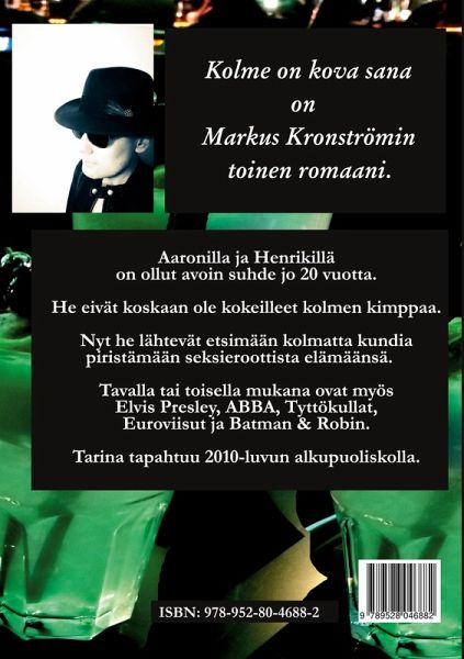 Aaronilla ja Henrikillä on ollut avoin suhde jo 20 vuotta. He eivät koskaan ole kokeilleet kolmen kimppaa. Nyt he lähtevät etsimään kolmatta kundia piristämään seksieroottista elämäänsä. Tavalla tai toisella mukana ovat myös Elvis Presley, ABBA, Tyttökullat, Euroviisut ja Batman & Robin. Tarina tapahtuu 2010-luvun alkupuoliskolla. Kolme on kova sana on Markus Kronströmin toinen romaani.