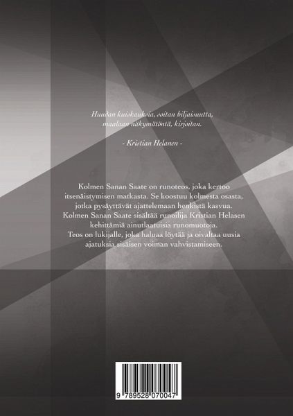Kolmen Sanan Saate on runoteos, joka kertoo itsenäistymisen matkasta. Se koostuu kolmesta osasta, jotka pysäyttävät ajattelemaan henkistä kasvua. Kolmen Sanan Saate sisältää runoilija Kristian Helasen kehittämiä ainutlaatuisia runomuotoja. Teos on lukijalle, joka haluaa löytää ja oivaltaa uusia ajatuksia sisäisen voiman vahvistamiseen.