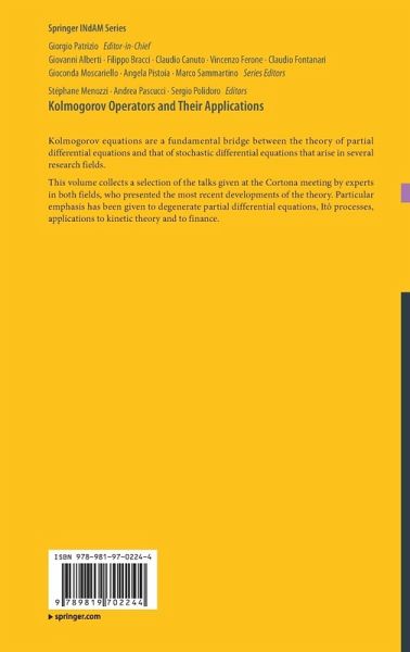 Chapter 1. Local Regularity for the Landau Equation (with Coulomb Interaction Potential).- Chapter 2. L 2 Hypocoercivity methods for kinetic Fokker-Planck equations with factorised Gibbs states.- Chapter 3. New Perspectives on recent trends for Kolmogorov operators.- Chapter 4. Schauder estimates for Kolmogorov-Fokker-Planck operators with coefficients measurable in time and Holder continuous in space.-Chapter 5. A new proof of the geometric Soboleva embedding for generalised Kolmogorov operators.- Chapter 6. Intrinsic Taylor formula for non-homogeneous Kolmogorov-type Lie groups.- Chapter 7. Form-boundedness and sdes with singular drift.- Chapter 8. About the regularity of degenerate non-local Kolmogorov operators under diffusive perturbations.- Chapter 9. Integration by parts formula for exit times of one dimensional diffusions.- Chapter 10. On averaged control and iteration improvement for a class of multidimensional ergodicdiffusions.