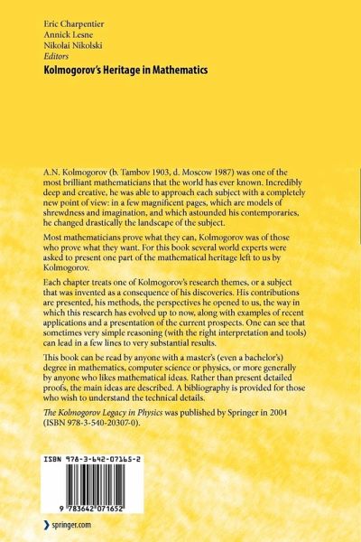 From the reviews: "Andrei N. Kolmogorov (1903-1987) was one of the most prolific and influential mathematicians of the twentieth century. ... this collection would be read by those who hold only a bachelor's degree in mathematics, computer science or physics, and more generally, by those interested in mathematical ideas. ... This impressive collection gives the reader an understanding of the depth and breadth of Kolmogorov's contributions to mathematics. Each chapter includes a substantial list of references that invite further reading." (Elena Anne Marchisotto, MathDL, December, 2007) "The object of Kolmogorov's Heritage in Mathematics is to enable the general mathematical reader (educated to master's level) to grasp something of Kolmogorov's achievements. ... I can judge, it is successful in its aim. ... those mathematicians with a sense of history, who wish to place themselves within the general culture of mathematics, will find this book a worthy memorial to a great man." (T. W. Korner, SIAM reviews, Vol. 50 (4), December, 2008)