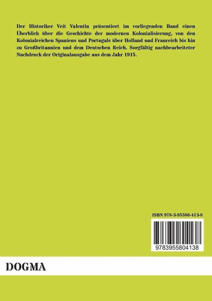 Der Historiker Veit Valentin präsentiert im vorliegenden Band einen Überblick über die Geschichte der modernen Kolonialisierung, von den Kolonialreichen Spaniens und Portugals über Holland und Franreich bis hin zu Großbritannien und dem Deutschen Reich. Sorgfältig nachbearbeiteter Nachdruck der Originalausgabe aus dem Jahr 1915.