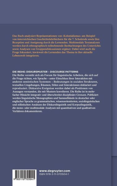 Das Buch analysiert Repräsentationen von 'Kolonialismus' am Beispiel von österreichischen Geschichtslehrbüchern für die 7. Schulstufe sowie ihre Rezeption und Aneignung durch die Lernenden. Multimodale Textanalysen werden durch ethnographisch-teilnehmende Beobachtungen des Unterrichts sowie Analysen von Gruppendiskussionen ergänzt. Dabei wird auch die Frage fokussiert, inwieweit die Lernenden das Thema in ihre aktuelle Lebenswelt integrieren.