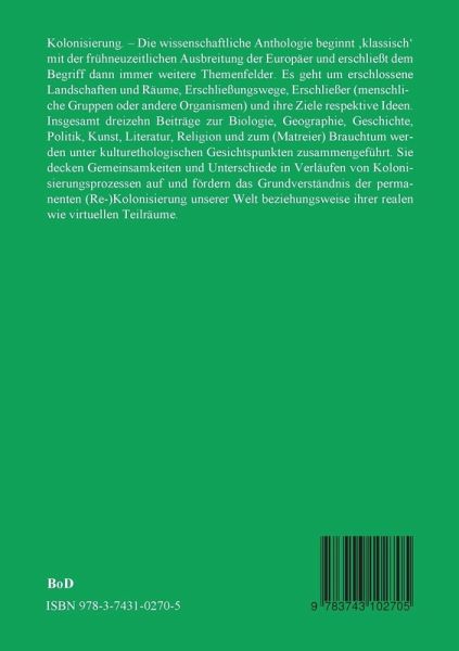 Kolonisierung. Die wissenschaftliche Anthologie beginnt "klassisch" mit der frühneuzeitlichen Ausbreitung der Europäer und erschließt dem Begriff dann immer weitere Themenfelder. Es geht um erschlossene Landschaften und Räume, Erschließungswege, Erschließer (menschliche Gruppen oder andere Organismen) und ihre Ziele respektive Ideen. Insgesamt dreizehn Beiträge zur Biologie, Geographie, Geschichte, Politik, Kunst, Literatur, Religion und zum (Matreier) Brauchtum werden unter kulturethologischen Gesichtspunkten zusammenführt. Sie decken Gemeinsamkeiten und Unterschiede in Verläufen von Kolonisierungsprozessen auf und fördern das Grundverständnis der permanenten (Re-)Kolonialisierung unserer Welt beziehungsweise ihrer realen wie virtuellen Teilräume.