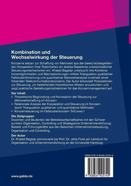 Konzerne setzen zur Schaffung von Mehrwert aus der bereichsübergreifenden Kooperation ihrer Teileinheiten ein breites Repertoire unterschiedlicher Steuerungsmechanismen ein. Khaled Bagban untersucht ihre Kombinationsmöglichkeiten und Wechselwirkungen mittels Triangulation qualitativer Fallstudienforschung und quantitativer Netzwerkanalyse innerhalb eines führenden Telekommunikationskonzerns. Der Autor entwickelt Propositionen zur Steuerung, um bestehendes theoretisches Wissen anzureichern und zeigt praktische Gestaltungsimplikationen für das Konzernmanagement auf.