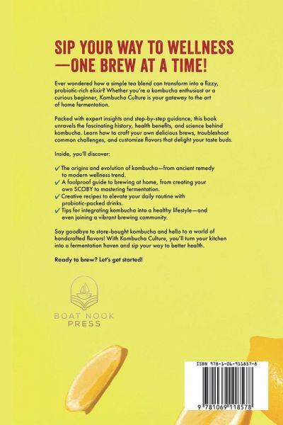 Remember that first sip of kombucha you questioned? Well, here you are, on the brink of becoming the next kombucha guru. As the ancient fizz transforms into a modern sensation, you wonder if it's possible to embark on a deliciously bubbly journey filled with flavors, health benefits, and a sprinkle of fermentation magic. Introducing Kombucha Culture, a must-read guide that invites you to the art of brewing kombucha. With every page turned, you'll unpack the fascinating history behind kombucha, its remarkable transformation from ancient remedy to modern delight, and enjoy its health benefits. Inside Kombucha Culture, you'll discover:A Comprehensive Introduction to Kombucha: Journey through its ancient beginnings, the science behind the brew, and how you can use it to optimize your health. How to Integrate Kombucha in the Modern World and Your Daily Life: Align it to your wellness lifestyle, learn to make your own SCOBY, and try out simple and enjoyable recipes from your kitchen! The Art of Brewing Kombucha at Home: Explore a step-by-step guide to creating your brewing sanctuary, flavoring your kombucha, and troubleshooting common issues seamlessly. Insights Into the Scientific Magic Behind Fermentation: Customize flavors that will tantalize your taste buds, create the perfect environment for your brew, and break down common misconceptions that might hold you back. Elevate Your Wellness Routine: Prepare probiotic-packed drinks, join a vibrant community of fellow kombucha enthusiasts, and transform your kitchen into a fermentation zone of creativity and fun! Say goodbye to lackluster drinks and hello to exhilarating flavors that will make your taste buds dance! After reading this book, not only will you master the art of brewing your kombucha, but you'll also discover how to incorporate this fizzy delight into your daily life. Join the kombucha revolution and transform your daily sip into a celebration of health and flavor.