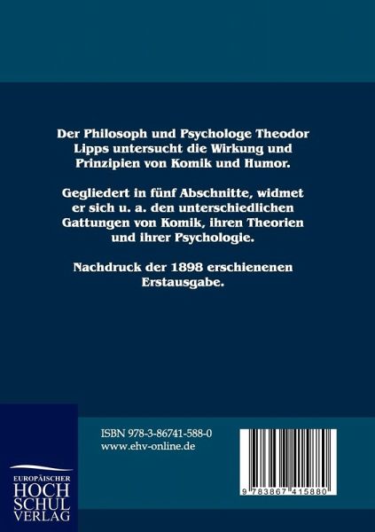 Der Philosoph und Psychologe Theodor Lipps untersucht die Wirkung und Prinzipien von Komik und Humor. Gegliedert in fünf Abschnitte, widmet er sich u.a. den unterschiedlichen Gattungen von Komik, ihren Theorien und ihrer Psychologie. Nachdruck der 1898 erschienenen Erstausgabe.
